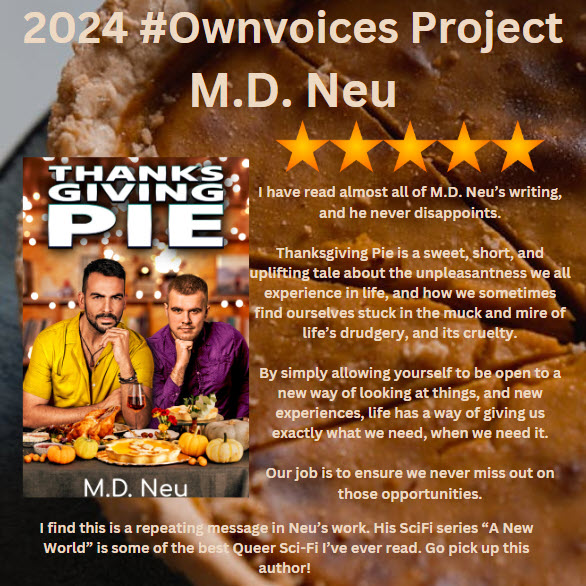 M.D. Neu and I have known each other for years. I am in continued awe of his stories, how much he puts out, and how accessible they all are. His “A New World” series is some of the best queer Sci-Fi I have read to date. Go get yourself some of Neu’s books. Great reading.